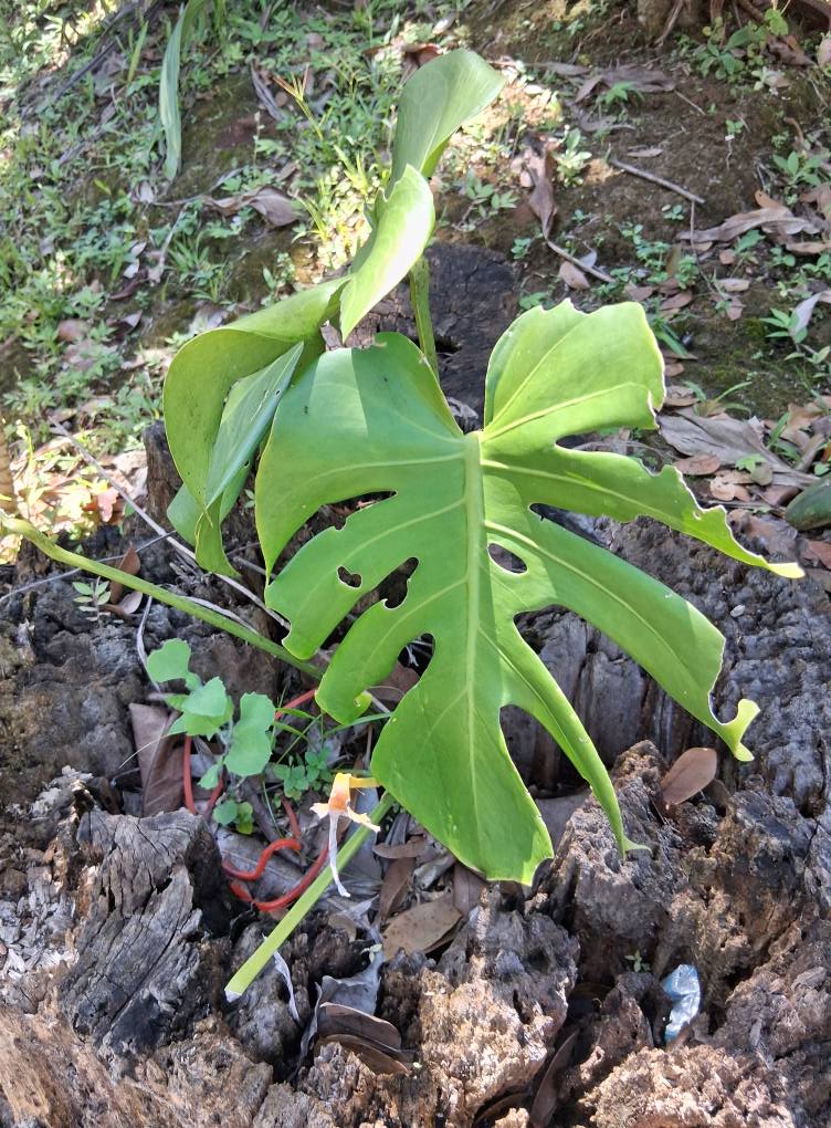 Monstera (aka split-leaf ) Philodendrom growing out of a stump.