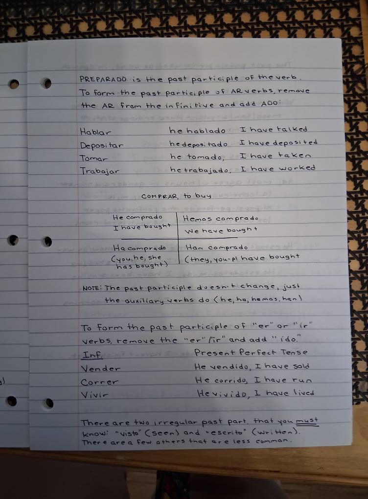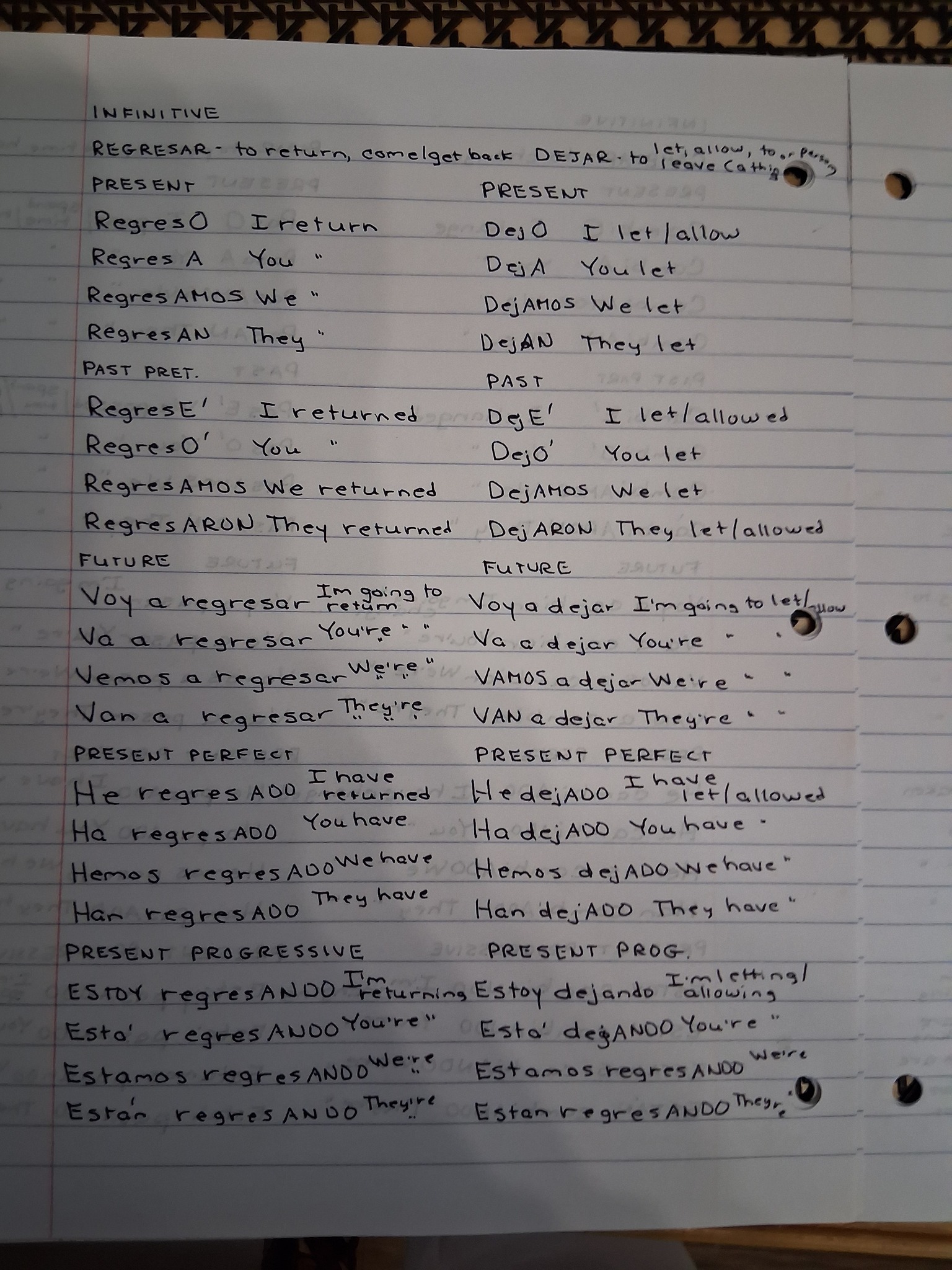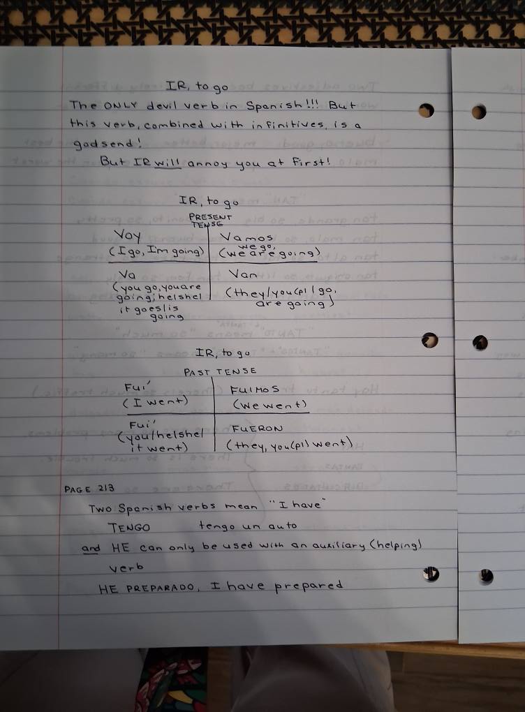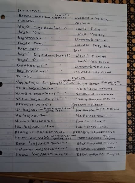 The exercise is to take all the verbs the author lists and write sentences or phrases that are in present, past, future, present perfect and present progressive tenses. Do you know how freaking many verbs there are in any given language? And the ones in Spanish end in “AR, “ER or “IR” and each of those has rules to write/speak by. So, for instance, I’ll show you several pages so you get the idea: