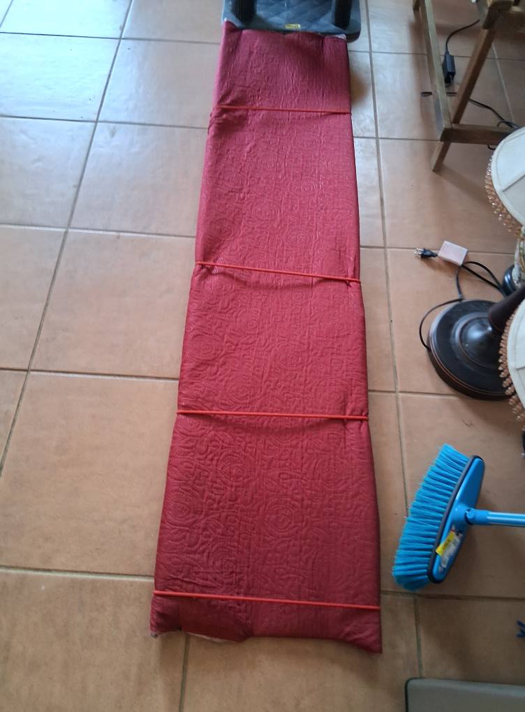 On the way back from the bank as I walked toward my Uber drop off place in front of Cafe Delicias, I spotted a fabric shop and walked in to find a bath mat-thickness piece of material to cover the metal shelf Melaney gave me (see below) so I can devise a way for Charli to get up the ladder to the loft in her room safely. I found one, a maroon colored piece and had the customer service lady cut off a piece of the required length.