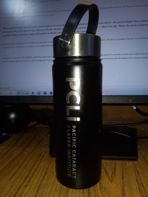 And then it was all over! The assistant peeled the sticky tape from around my eye and I sat up. They had me sit there for about five seconds to make sure I didn’t feel dizzy. I didn’t, so the assistant walked me out to meet Lisa after giving me a “care package” (standard eye drops, flyers, and a fabulous branded thermos with the name of the cataract and laser institute on it.)