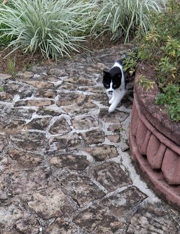 After it cooled down substantially, I took her out again. By this time I had put on shorts and a t-shirt and I was wearing crocs. I lifted a chair from the patio area and put it near the fountain sculpture so I could watch Charli at the same time I could watch for turkey buzzards and other potential hazards. But pretty quickly, neighborhood dogs started barking so Charli again decided to call it a day as far as being outside.
