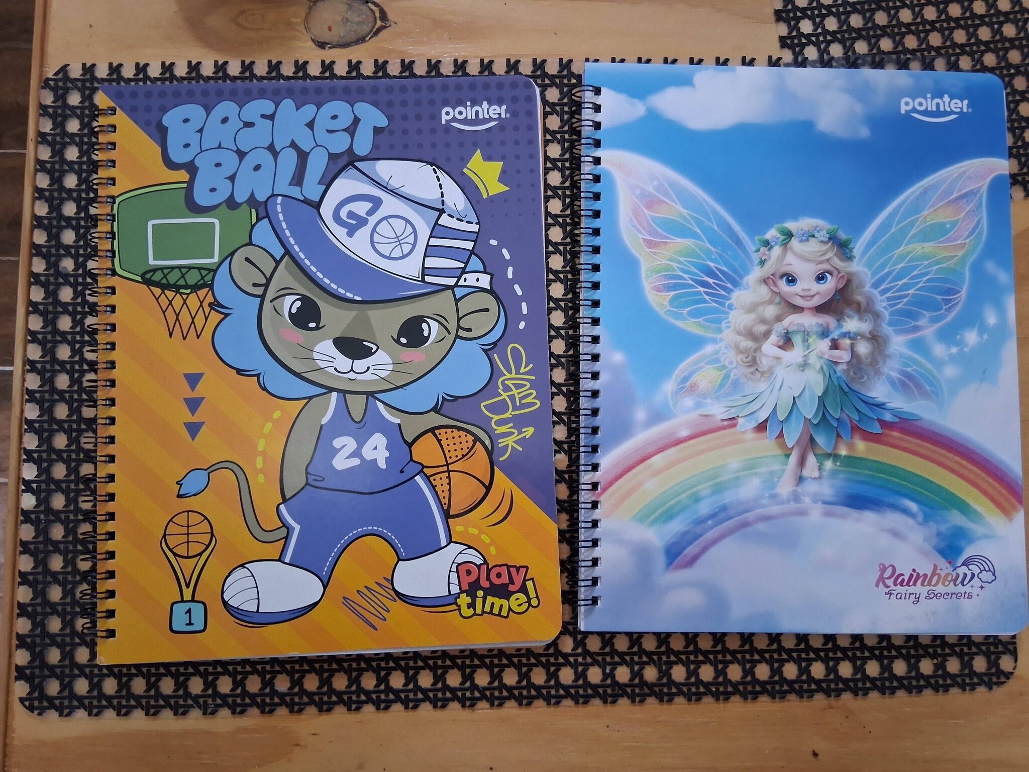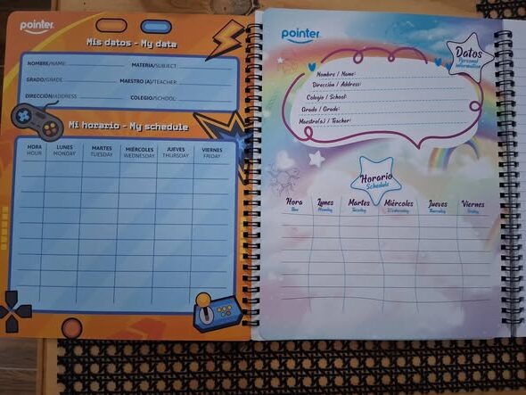 I bought two whimsical notebooks for elementary age school kids because they were on sale for about a dollar each and I couldn’t even get that many lined loose leaf papers for that low a price. The covers are in English, as you can see, but the inside covers are in English and Spanish.