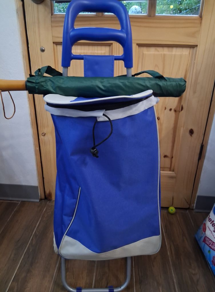When she arrived and saw me with what looked like a heckuva lot more stuff than I had ridden in with — a sizeable cart and adult sized umbrella in addition to the original Winco bag — she laughed and greeted me with, “Turista!”