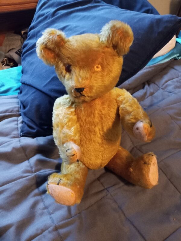 The second is a teddy bear which my Aunt Tod (Evelyn) gave me. It’s obviously ancient, and she told me it was a Steiff (although the signature button in the ear is long gone if that protocol was instituted during the time it was made; knowing how pernsickety she was, she may have removed it, considering it unsightly). But there are knock-off bears, too, and she could have been taken in by a scammer 100 years ago. Bears were manufactured back then to resemble Steiff bears. So, as I’m waiting to see if this bear can be authenticated by the Steiff Musuem (I have an email in to them now with pictures of the bear).If they can authenticate it, it’s worth a lot of money. Accoring to wikipedia, some of the oldest vintage Steiff bears have sold at auction for more than $120,000…