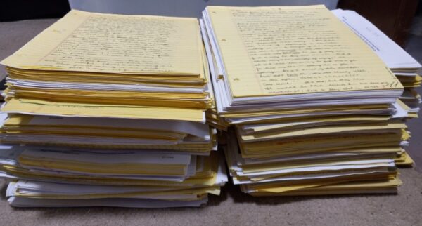 I have close to 60 more 75-page journals to preserve. I’m down to the last two stacks, the first one of which has already been separated into 75-page sections. The two stacks are about the same height, and there are 31 journals in the stack I just separated out, so 31 + 31 = 62. THE END IS NEAR. HALLELUJAH!!!